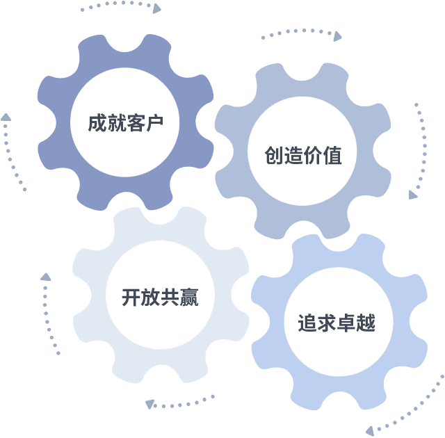 成就客户是一切决策的出发点,,,,创造价值是衡量所有工作的标准,,,,追求卓越是我们做事做人的态度,,,开放共赢是我们的格局也是最终的结果。。。价值观的齿轮环环相扣,,推动着组织里的每个人不断向前。。